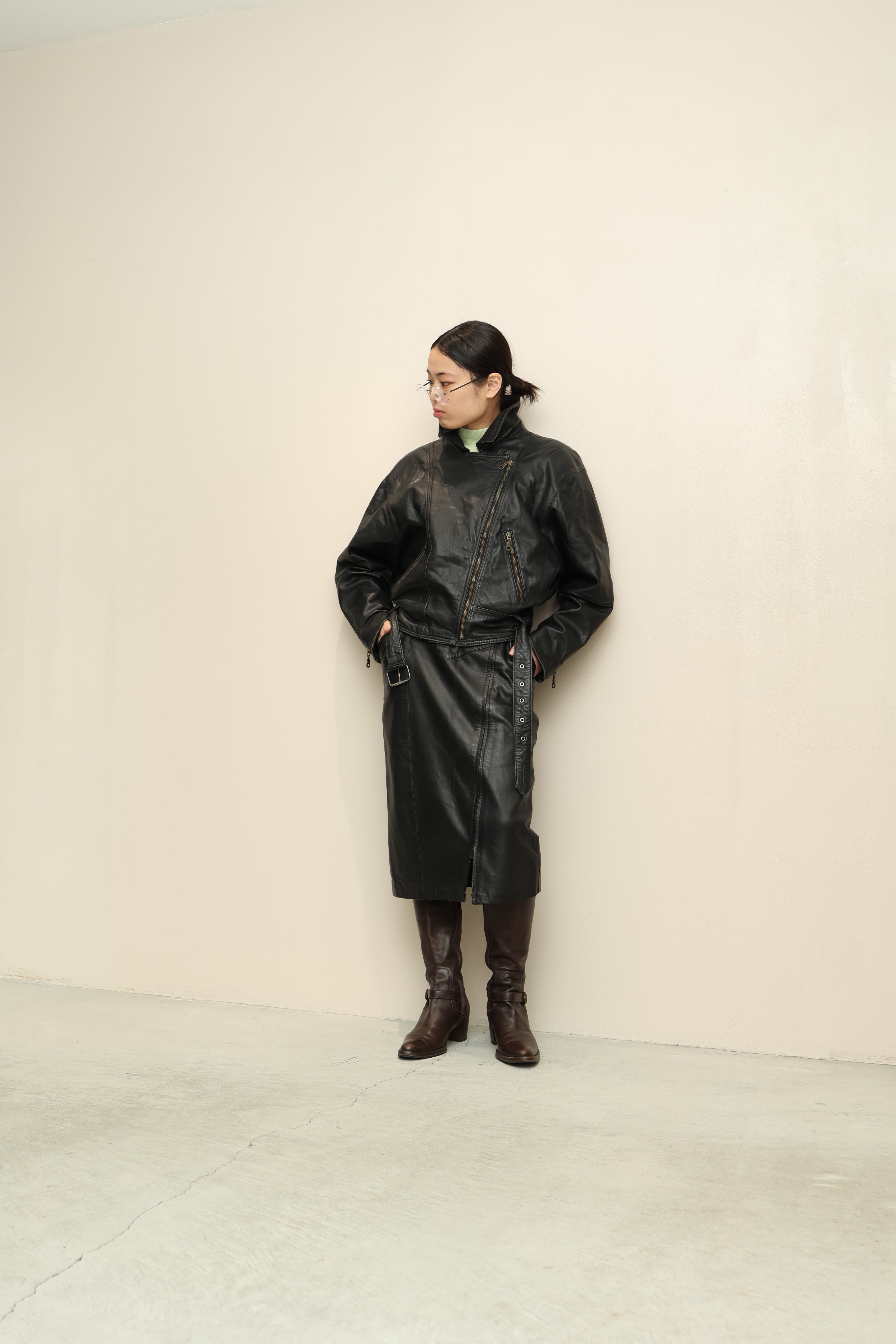 80-90's European label - front zip detail, leather graphical cutting skirt