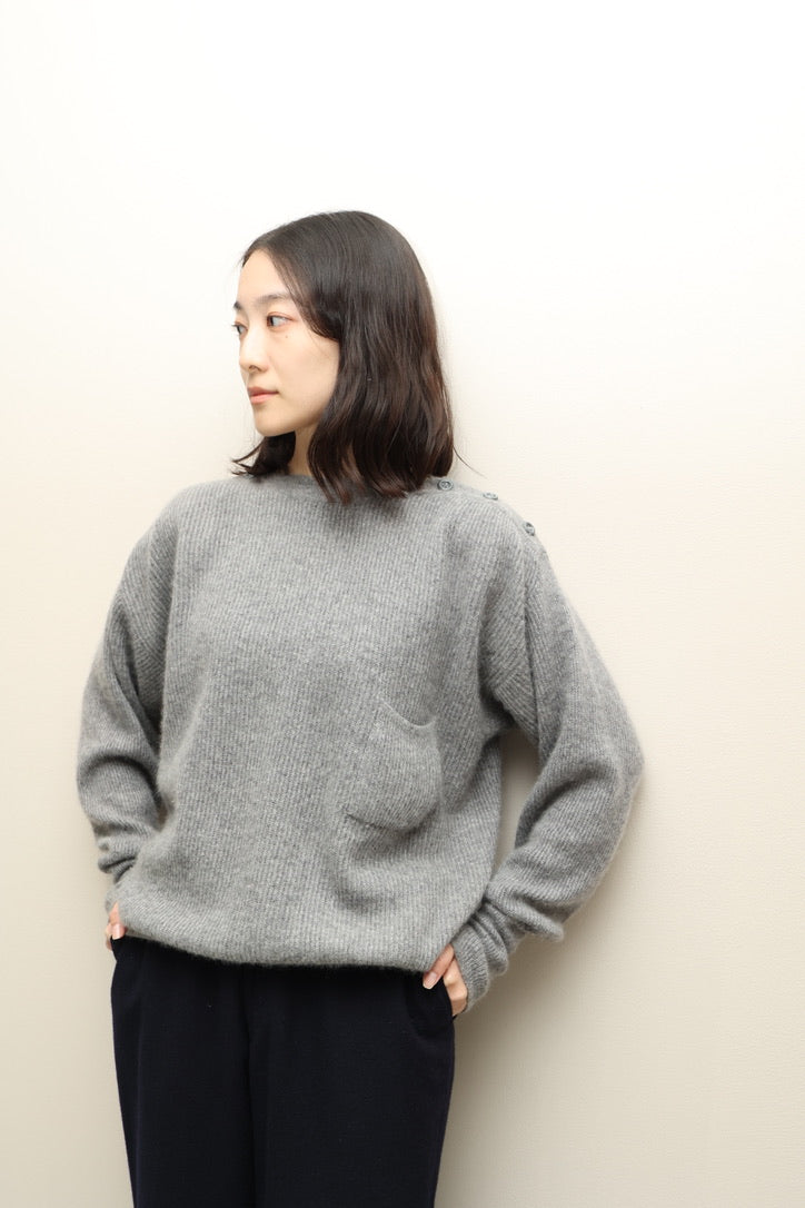 明るいグレーカラー、ボートネックに肩のボタンでアクセント(肩は開閉はしません)