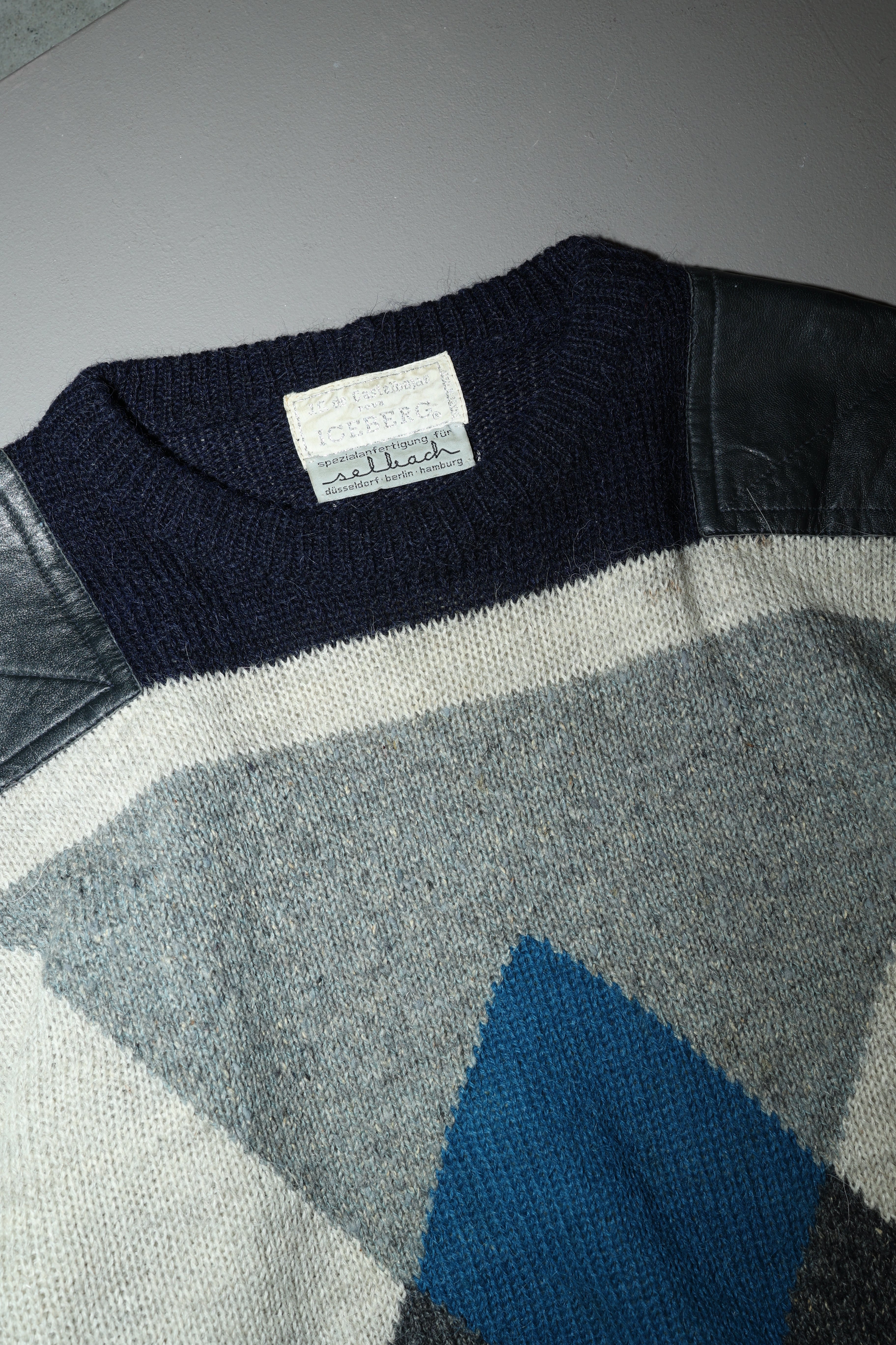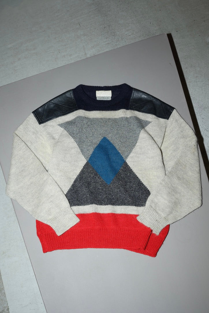 80’s J.C. de Castelbajac pour ICEBERG - geometrical pattern alpaca/wool knit jumper with leather shoulder patch